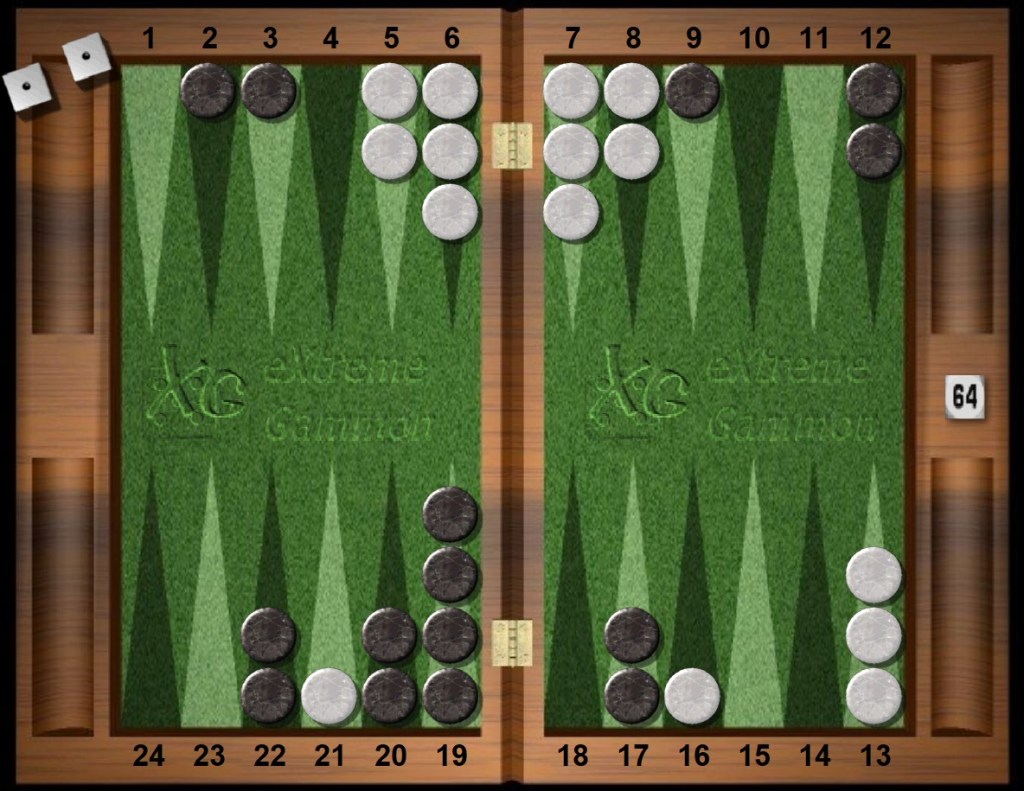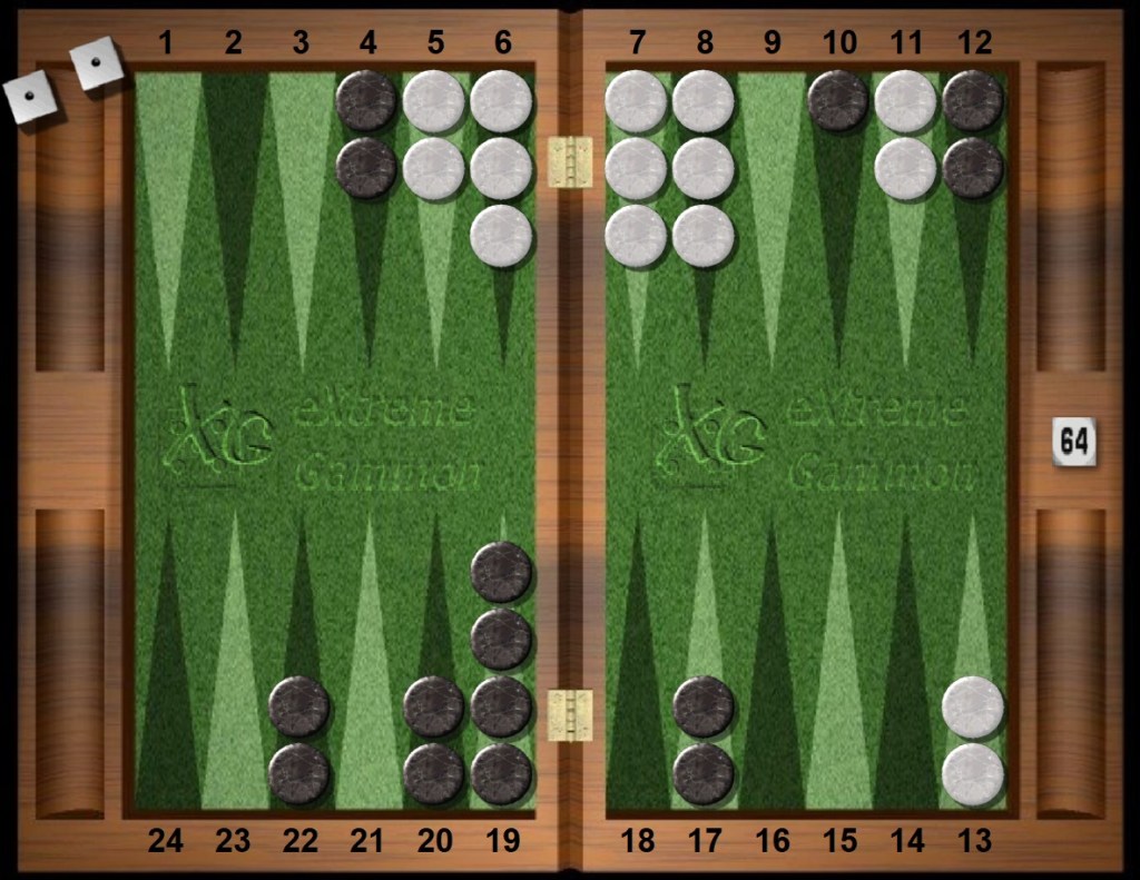 In this game, White waits to double. Then White rolls 55s, and turns her runners into an escaped Houdini position of 11pt and midpoint, plus betters her pip count lead to almost three rolls. Very good.