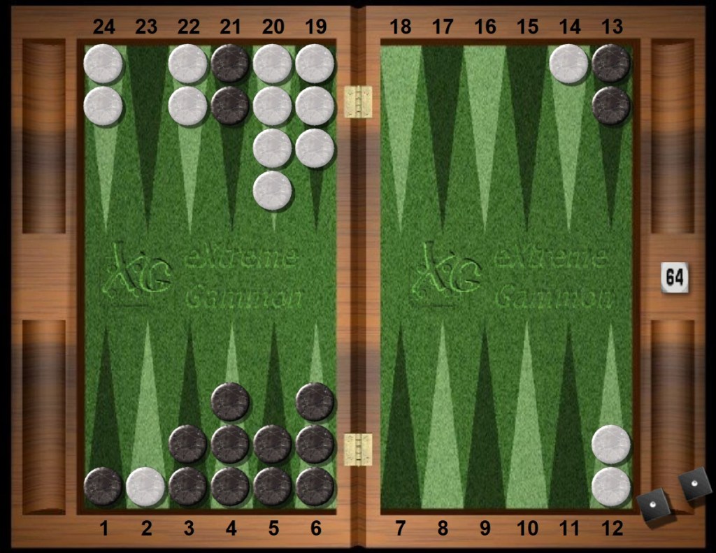 Cash game. Jacoby rule. Black on roll. Black has a good double, with much the better of the gammon chances. Rollouts reveal that Black wins twice as many gammons here. Close race, but trailing White by a roll. Black has the better board and a premium anchor. The attack chances strongly favour Black, with some points on the head of the white blot and some pick-and-passes onto the acepoint, hitting. Tally of shots: eight rolls to hit and point, plus the six fly shots to hit in the outfield. Include a few shots hitting loose within Black’s better board, and Black has plenty of fire power to justify a first double. All in all, good prospects.