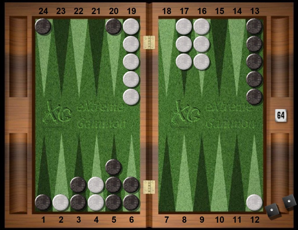 Of course White has a Take. For money White has a take based on the good anchor and sensible chances in any race later, plus the upcoming threats. The position is only a bit more gammonish than an initial opening toss, which helps the take since White’s gammons now win the match whereas Black’s gammons do not. They only achieve the Crawford game.