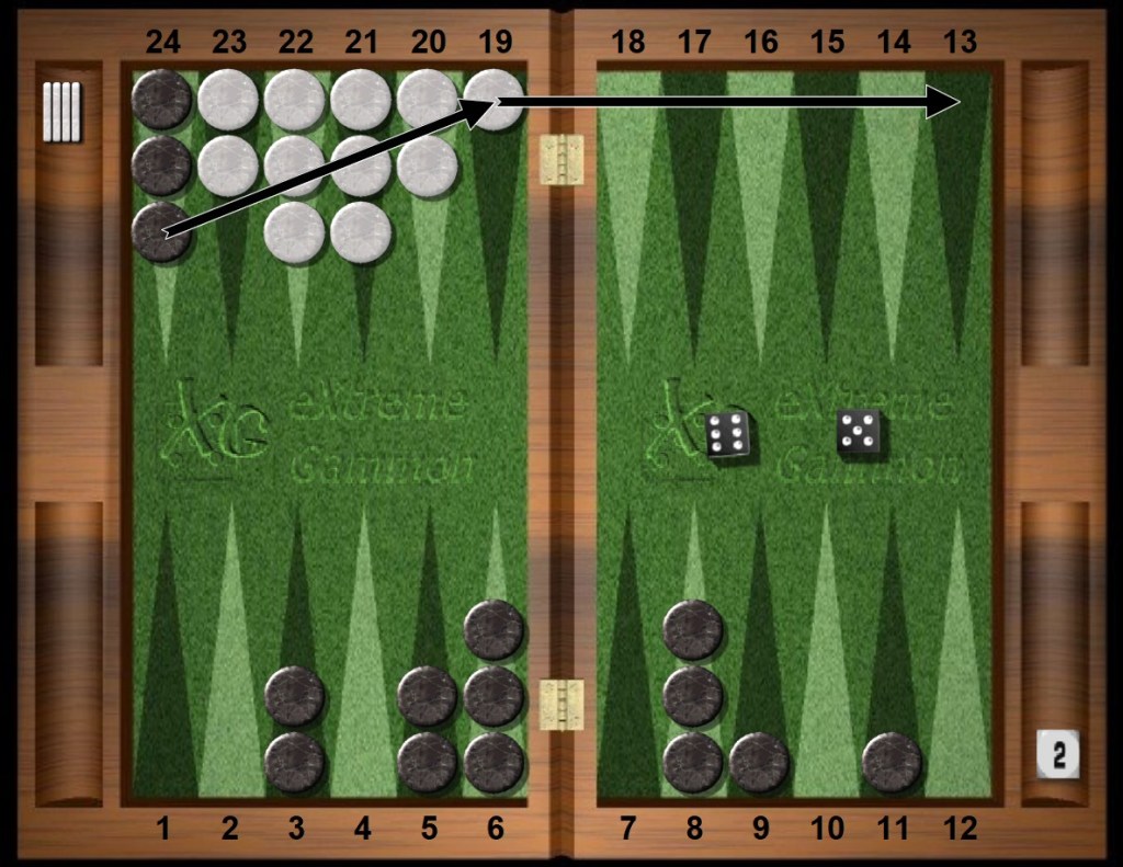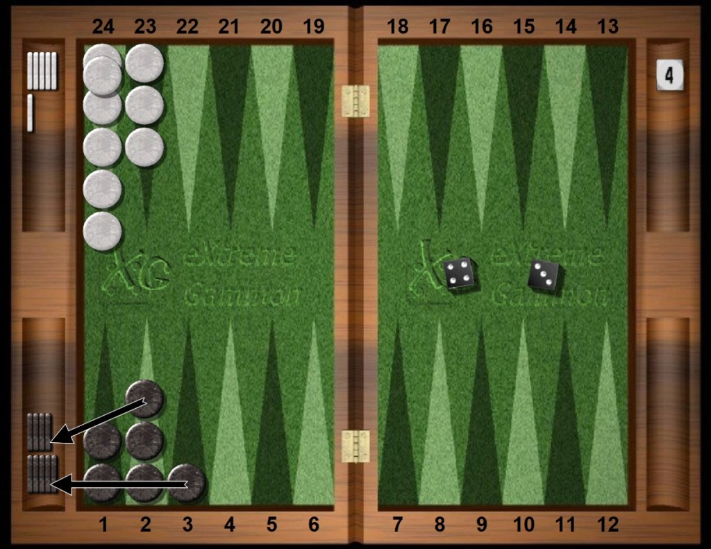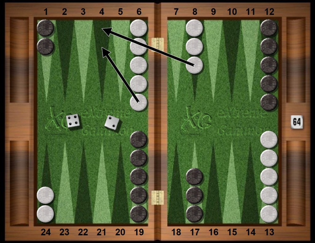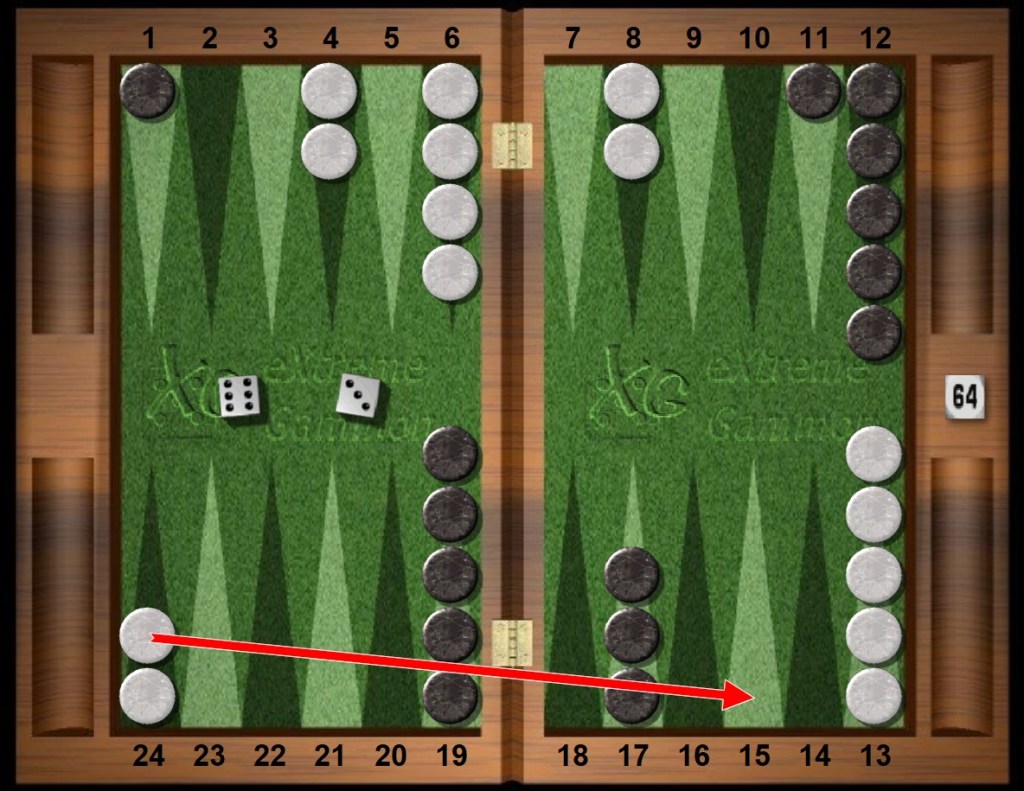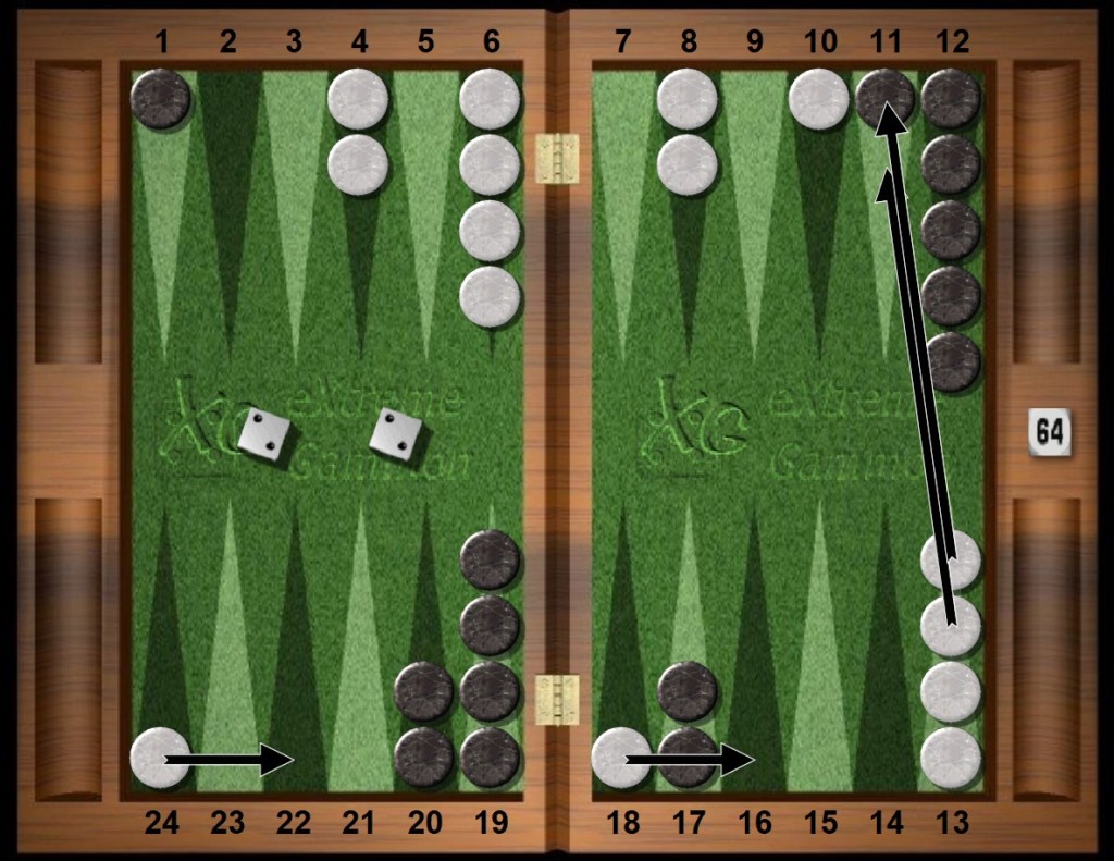 White rolls 36s. Running a white backman to blot in the outfield when Black’s previous 14pt blot awaits is simply a bad idea. The extra direct shot lets Black attack with lightning quickness.