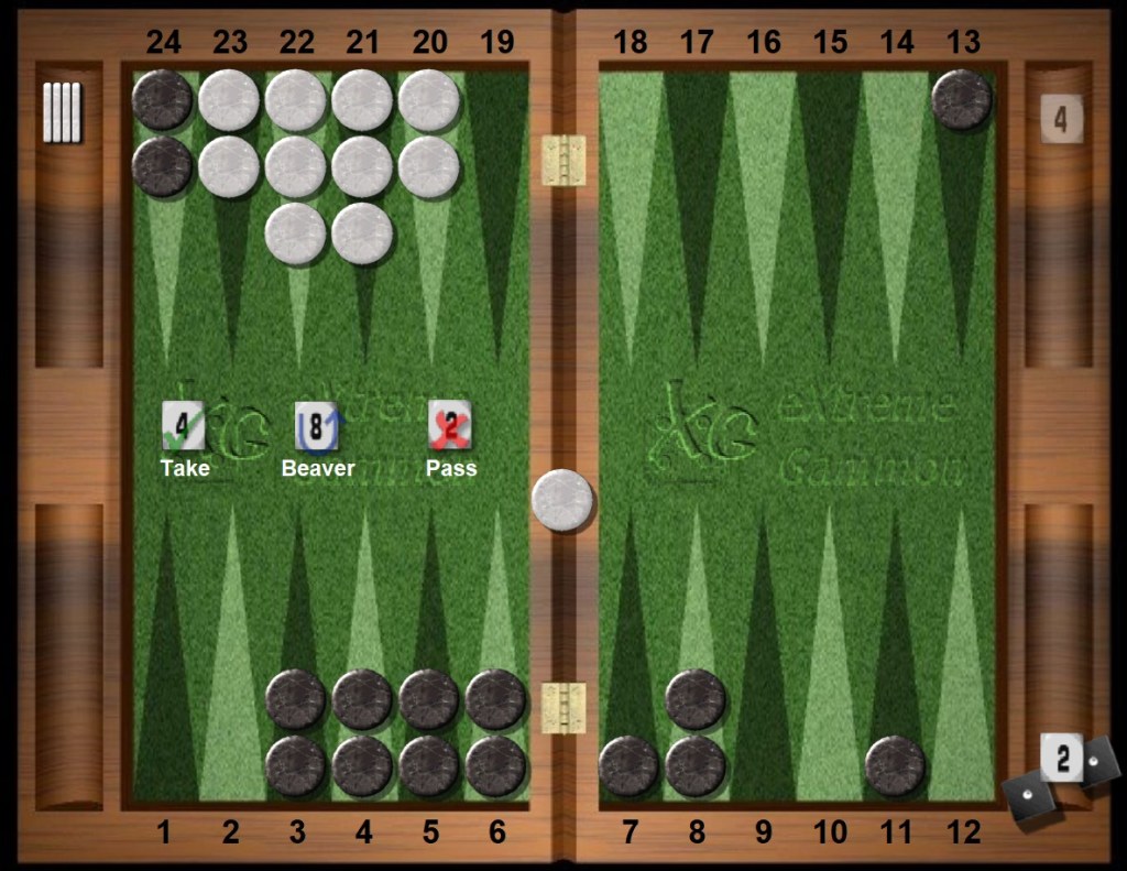 White takes the redouble. Rollouts confirm this is a close pass. And the finale for Black.