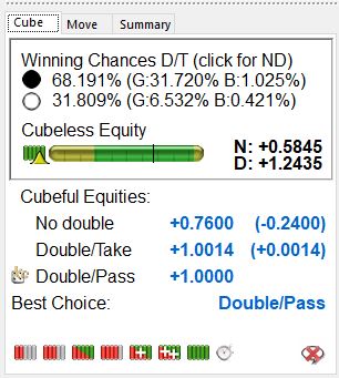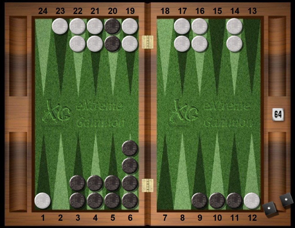 Black has a variety of market losers. Doubles fives can point and run. Flexible rolls can make the barpoint, a gem of a blockade. And fly shots can hit White’s midpoint blot. Lastly, in a pinch, White’s home blot invites Black to hit loose on the 1pt white blot within Black’s home board. Some situations demand that White be put off-kilter and face an imminent cube.
