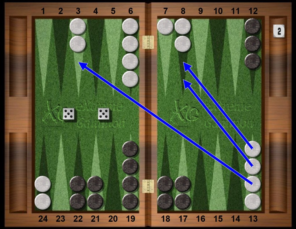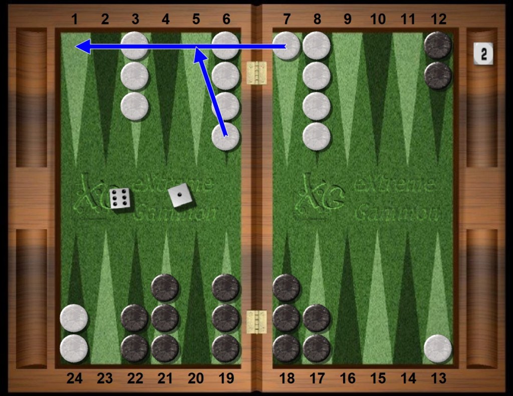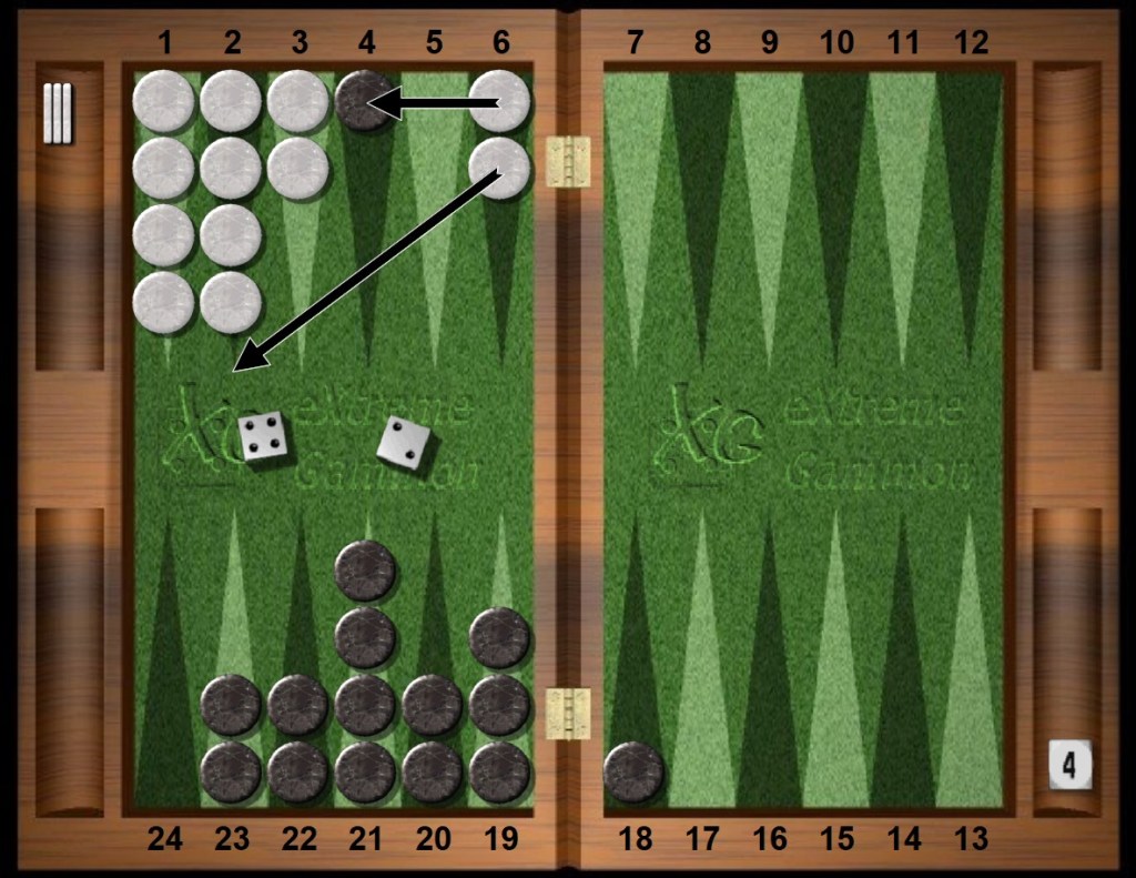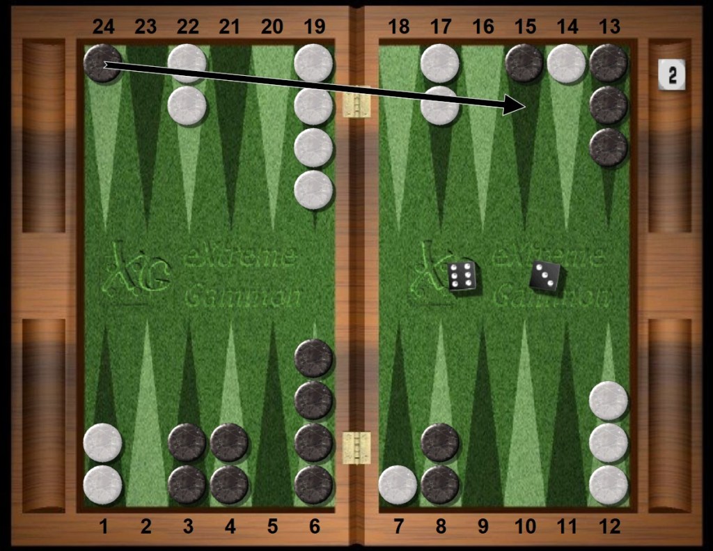 To recap: Both players open strong, White creates two spare blots, Black hits one, White dances with no paparazzo in sight and then, in the blink of an eye, Black contemplates a first cube.
