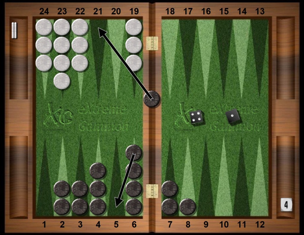 Black’s gut follows the script of this horror flick … wait for it … that’s right … Black dances. Then White redoubles to 4. Black breathes deeply, and takes the recube.