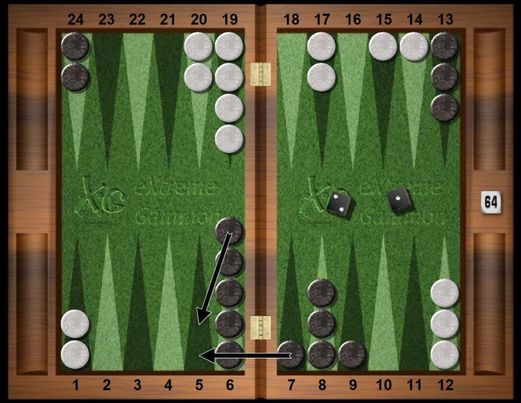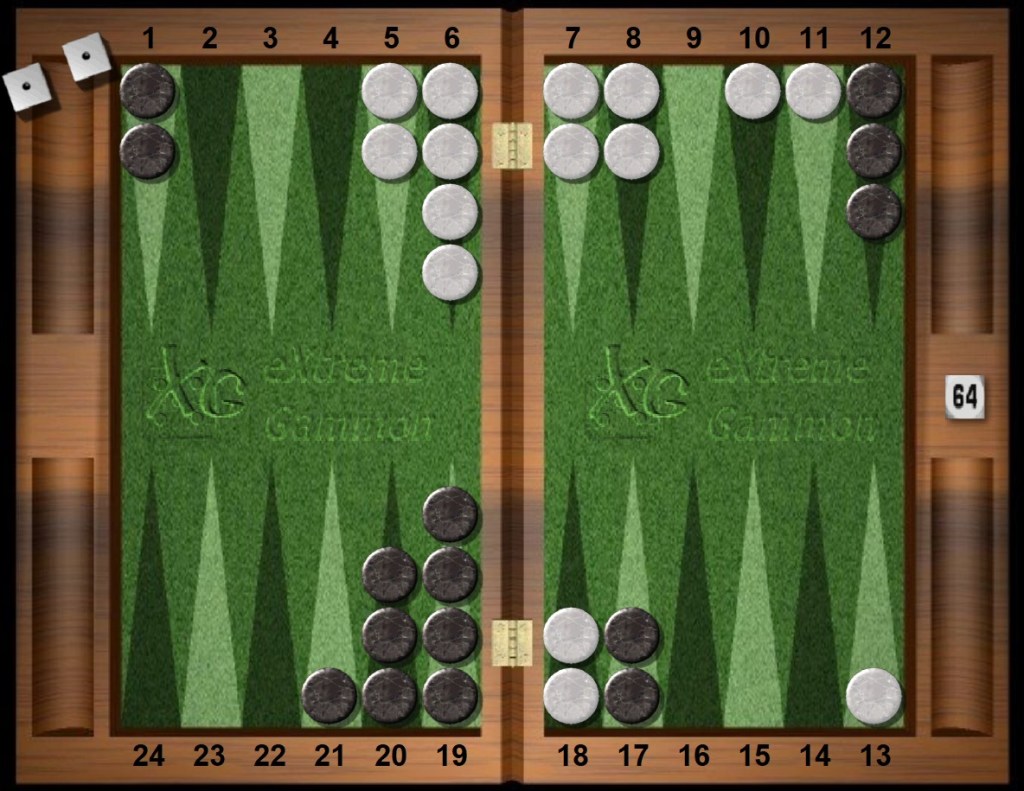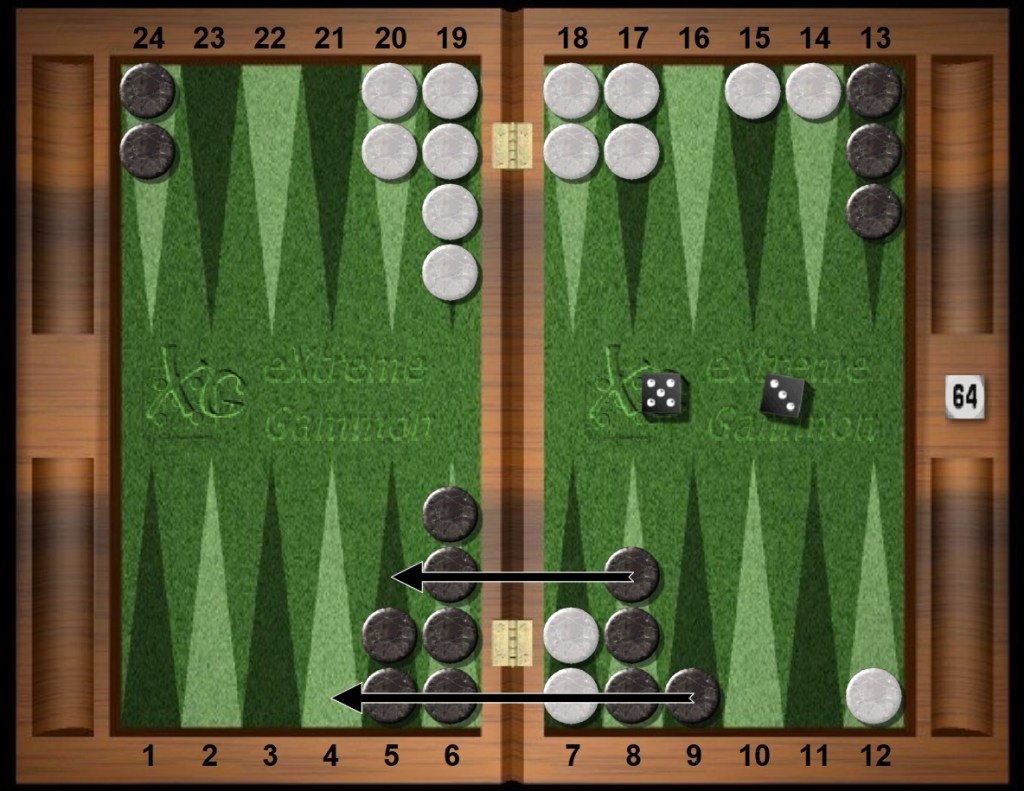 Below is an example. Game #1 of a three-point match. White opens with the roll 13s and makes her 5pt. Black rolls 64s, a toss which usually offers three sensible plays as an opening roll but now these plays spread in equity as specific replies to a strong opening by White. Include a deprecated play once preferred during the wild 1970s and several 64s moves react distinctly to White’s new home board strength.