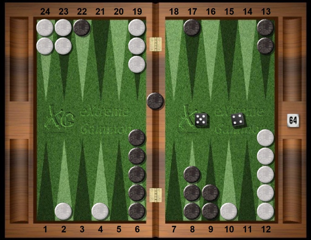 Black is on the bar and must choose which location inside White’s home board to enter after the roll Black 54s.