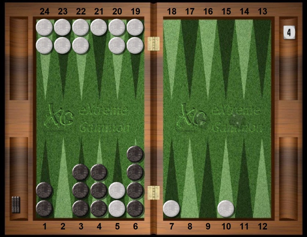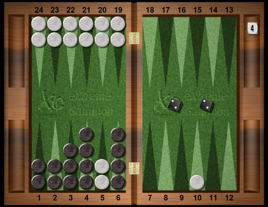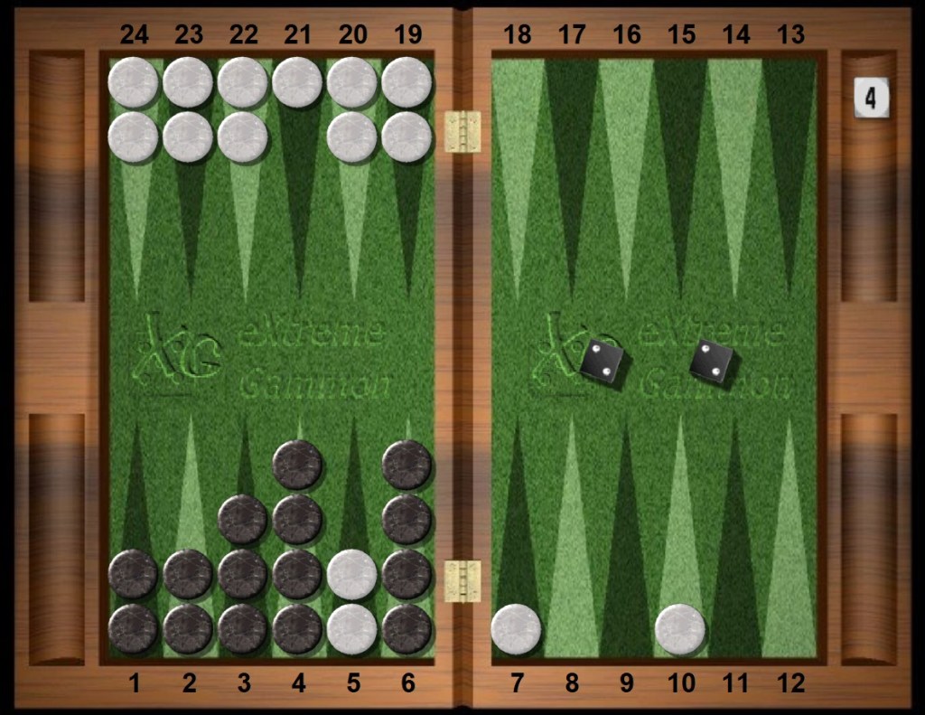 White now has little chance to win this game and sometimes will fail to remove any checkers at all, thereby losing a gammon at a 4-cube. Ouch.