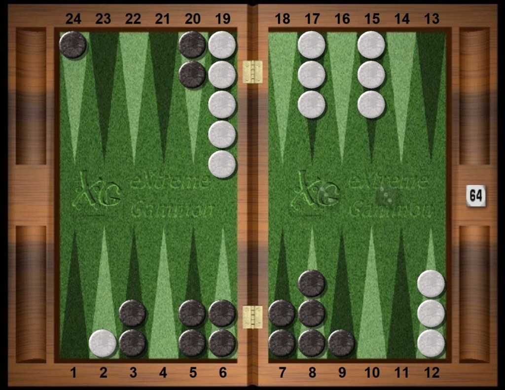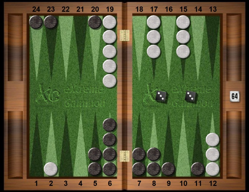 The best play is now obvious: the 24pt and the 11pt black blots are as safe as possible and the home 6pt spare is ready to attack.