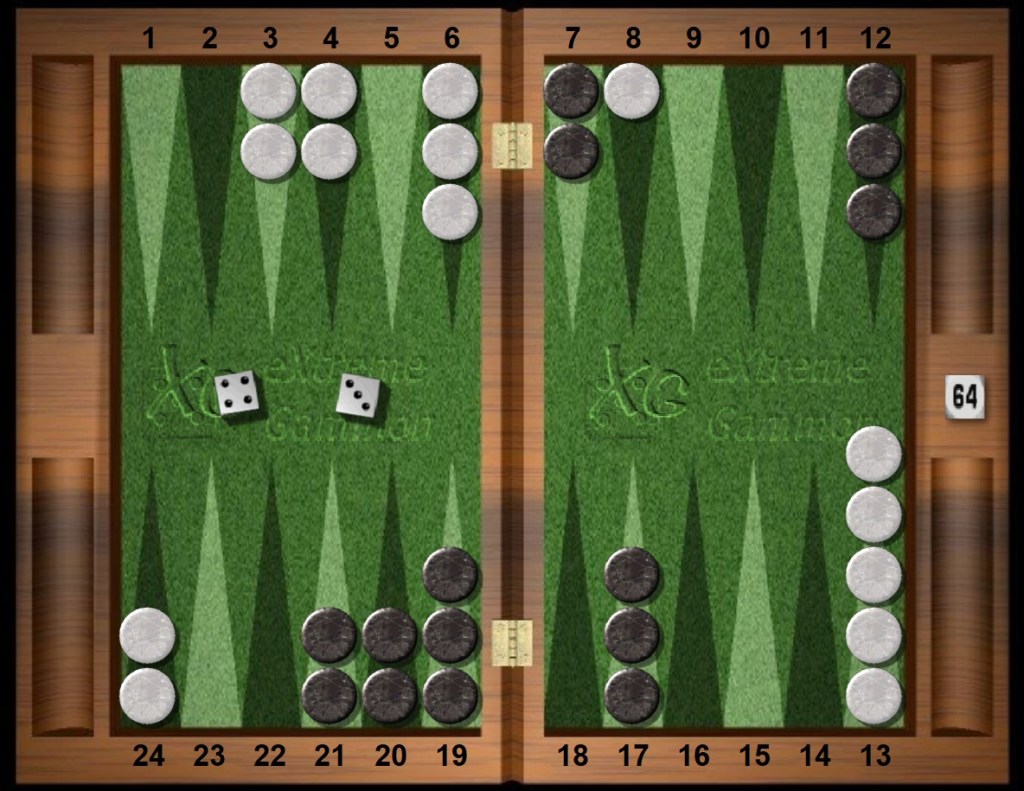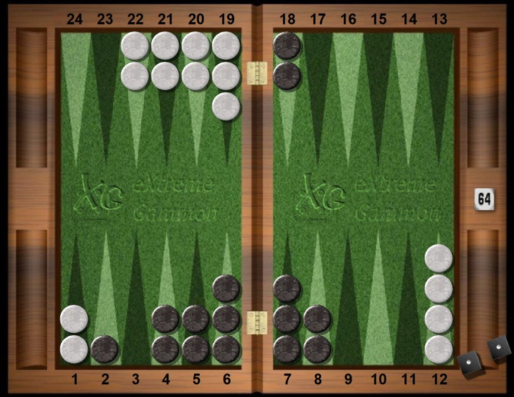 The second time Black glances at the cube, after his play of the first boxcars followed by White’s home slot, Black has 664 market losers. This tally is more than half of the upcoming exchanges and for a first double (with the Jacoby rule) is always a cash — White must pass.
