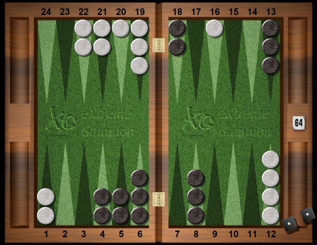 Black rolls a second toss of boxcar 66s. Black clears the midpoint to make the blocking 7pt along with a spare and then slots his deuce point, a location where White’s hit requires an indirect escape from Black’s menacing prime.