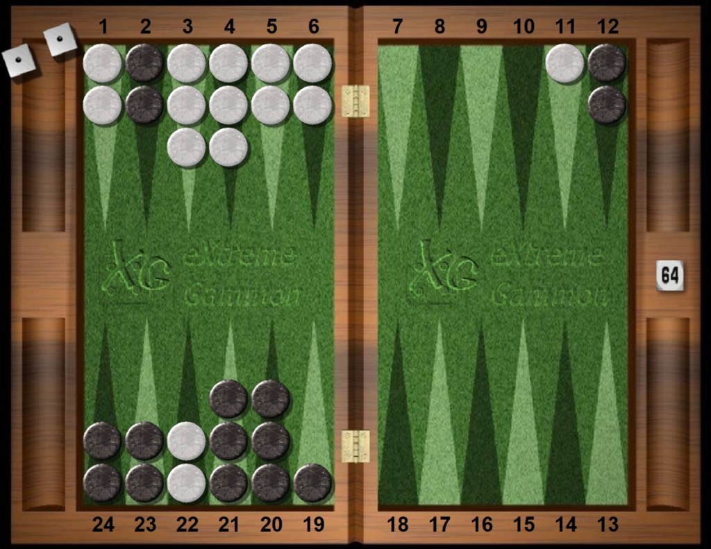 Both White and Black have a mediocre anchor. White’s board is still intact, Black’s has an exposed blot on the broken 6pt. Only a midpoint checker can cover the black 6pt. Black is behind in the race too by roughly the midpoint checkers. Plus White threatens to hit and escape.