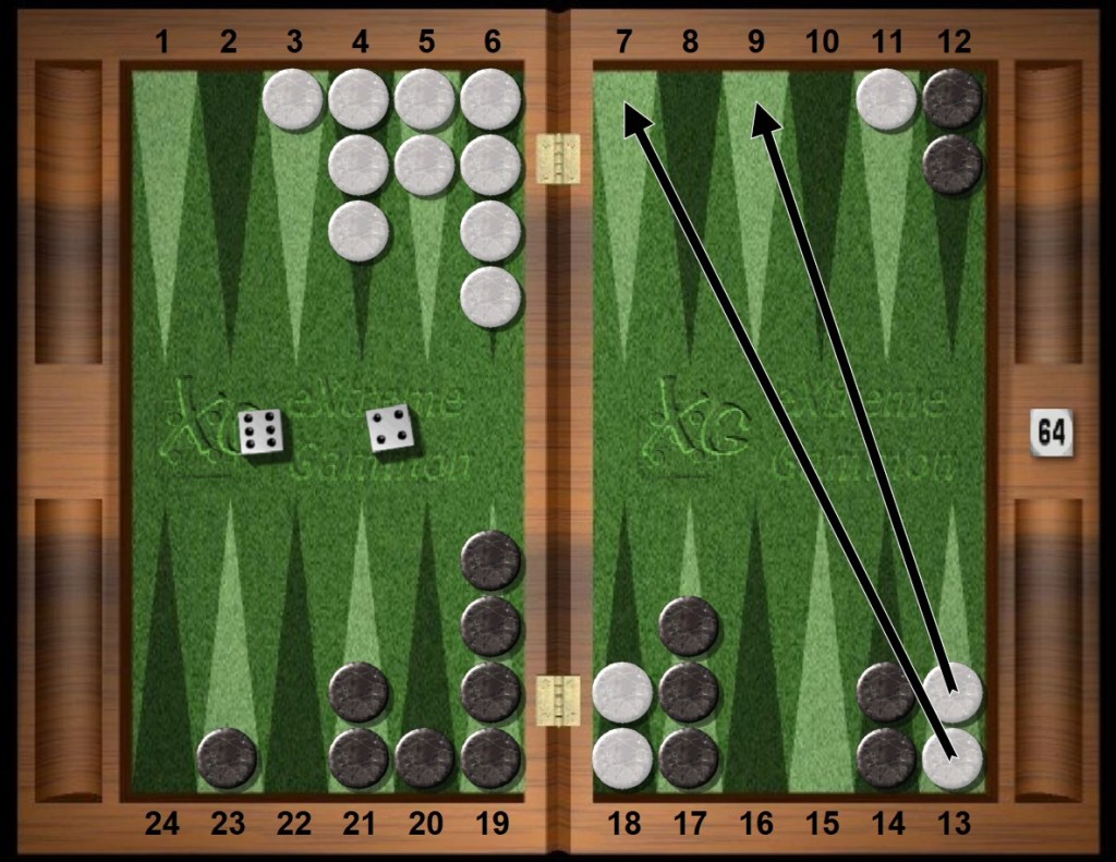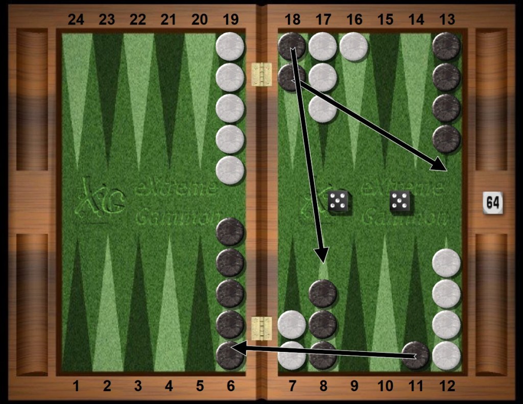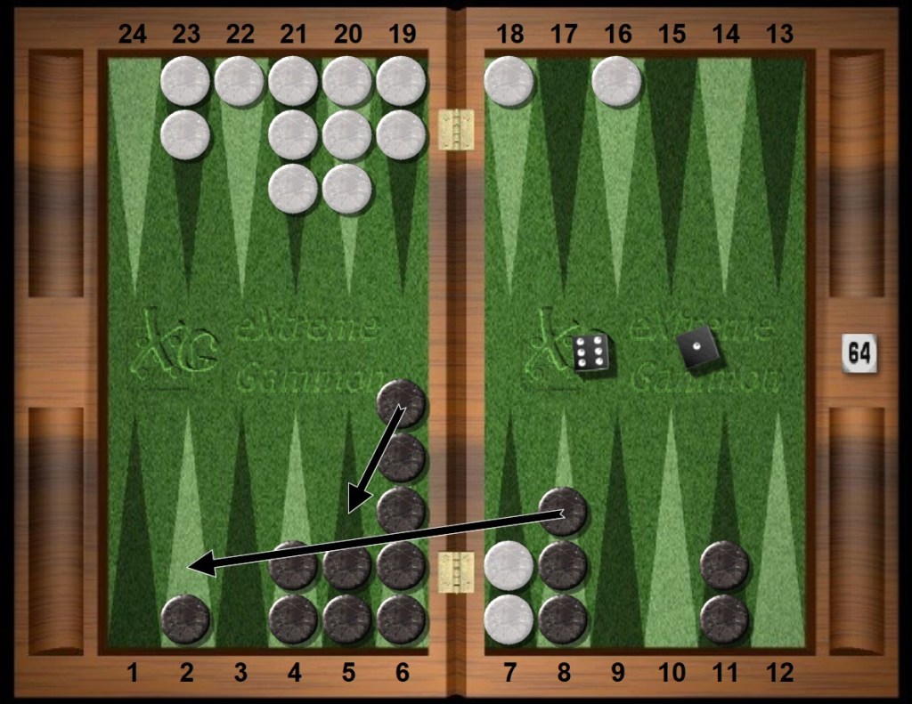 Black rolls the perfecto 52s to clear his midpoint, ironically making his previous mistake the “right” play. That’s backgammon!