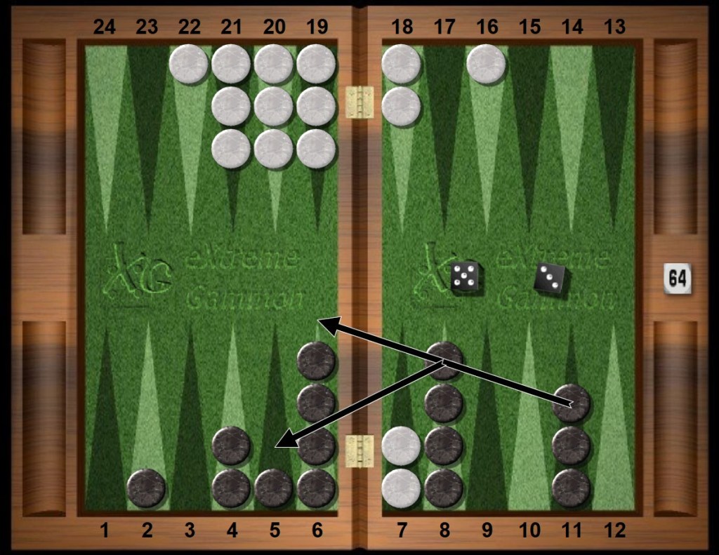 Here, due to recent symmetry in game plans, White’s objectives still apply to Black. Therefore, Black must make a new outfield landing post (either 11pt or 9pt) and downplay the early need for home board strength. White will not be volunteering blots any time soon, and neither will Black. Hence the three choices (in equity order) are the 9pt, the 11pt with spare, or the bronze medal 11pt-4pt combination. In the game Black chose the combination. The 9pt is correct.