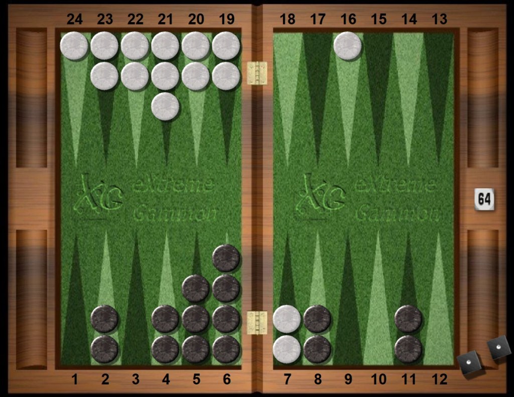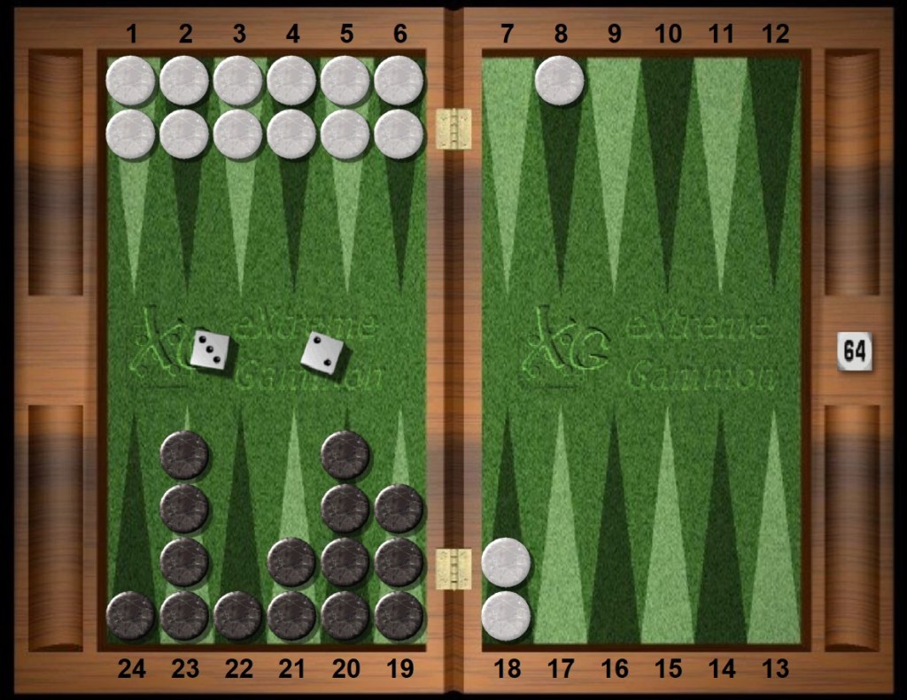 The game flow is simple and exhibits a symmetry of progression. Both Black and White have barpoint anchors, both players are bereft of home board points, and both have an outfield blot coaxing the other to break anchor to hit. A simple symmetry count says White leads the race by two pips but Black is on the roll. The situation has an austere beauty, almost a new starting position, but with first strike advantage for Black who enjoys the roll and the initiative.