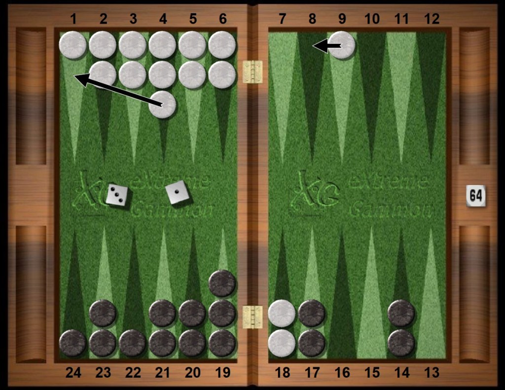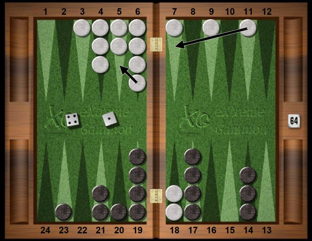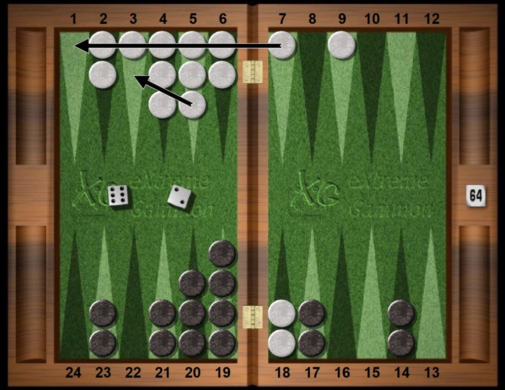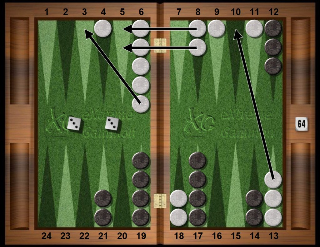 White rolls 24s. Normally, making the White home 4pt with White 8/4 6/4 is obviously best but now, because of the strategic situation, making the home point is tied with making more points faster in the near future. Hence White puts more checkers in the Zone and also slots a home point. The two plays are equal in equity, primarily because Black has outfield spares that make forced blots unlikely soon and White wants to hit later in the game anyway when it is a knockout punch. Hence White tries to build a superb board quickly. The next few plays continue with White’s mindset.