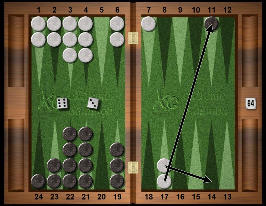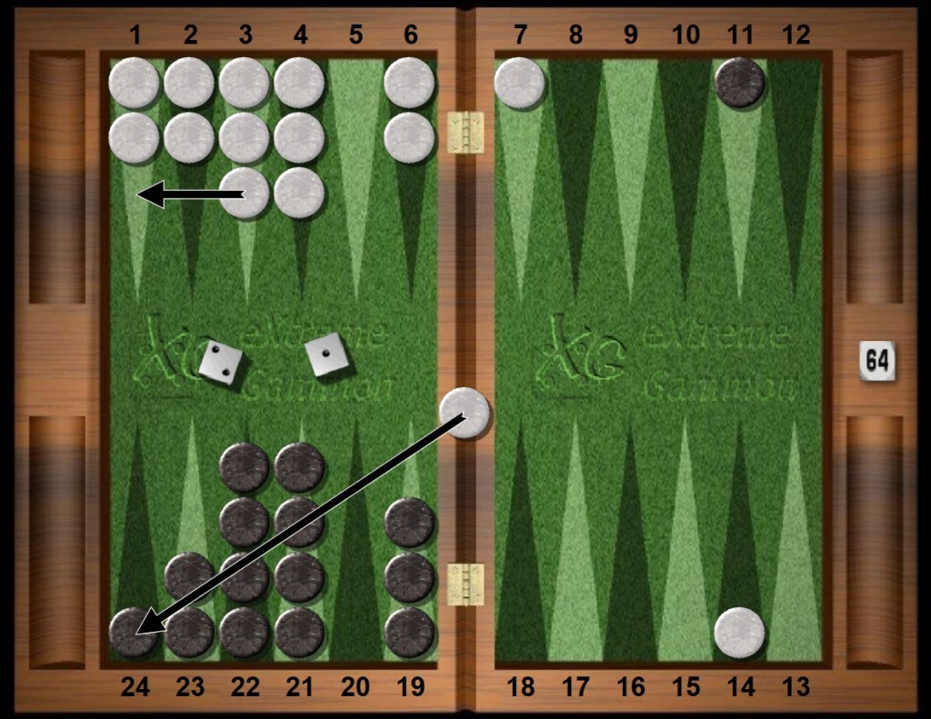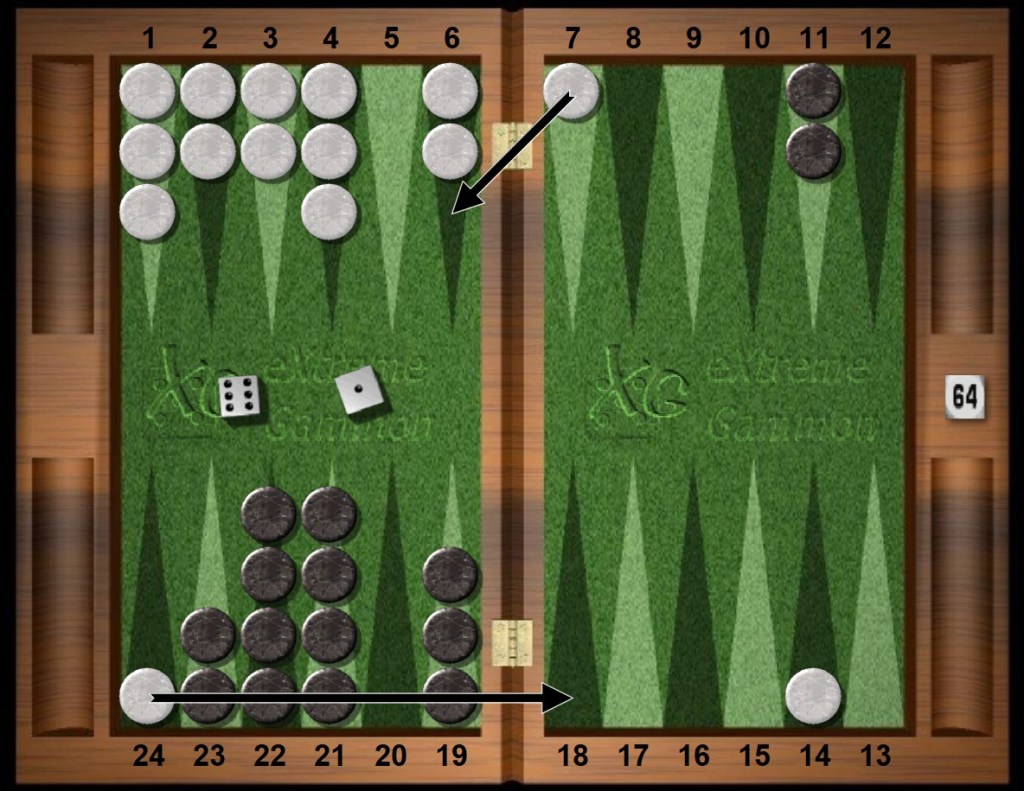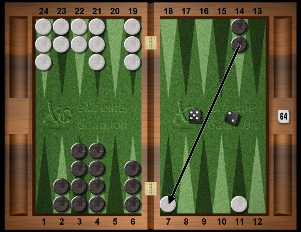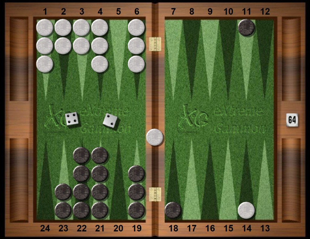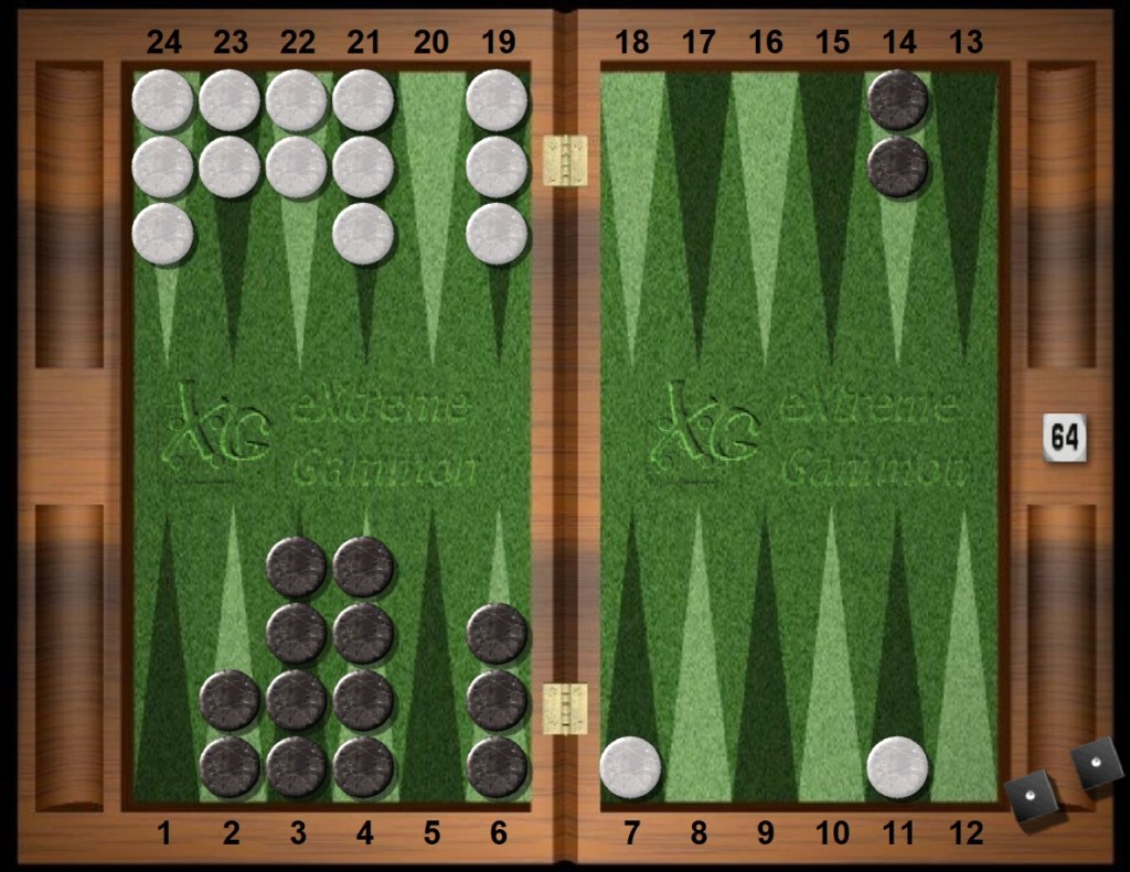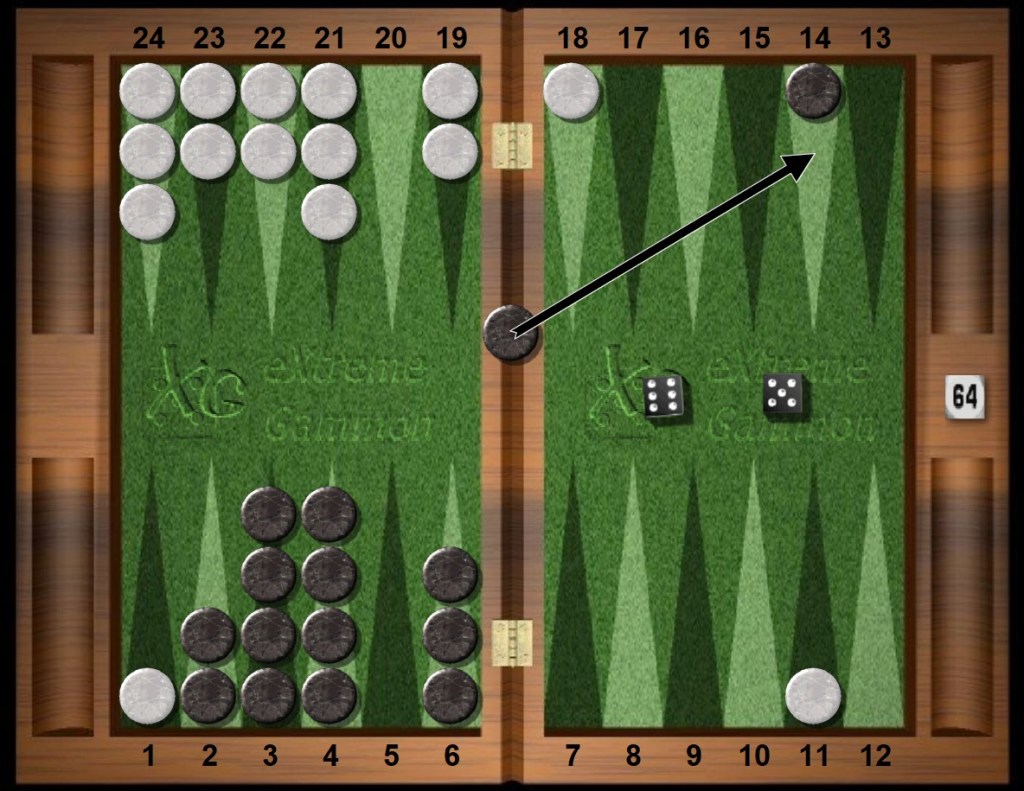 Black rolls 64s and frantically looks around for another play. The six is forced in this situation. Black’s outfield 14pt has a special relationship with White’s outfield anchor. Borrowing from chess, the White and Black points are said to be in opposition to each other, six pips away, glaring.