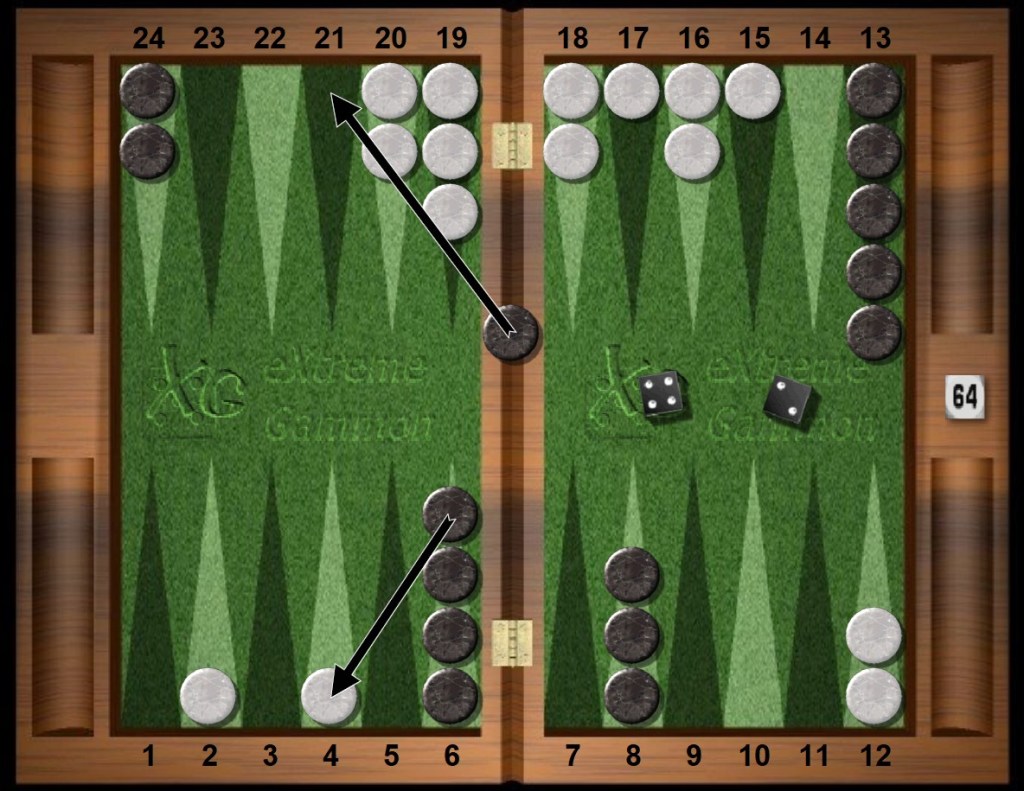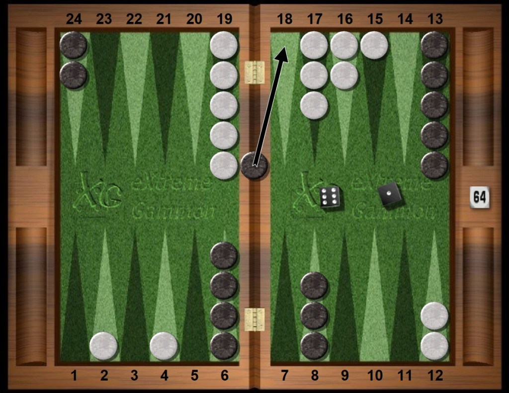 White hits the black blot in the outfield and brings another builder down into the attacking zone. This time a golden anchor is just not right. White must attack and pocket the pips in the race.