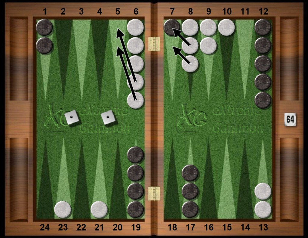Black replies with the roll 63s and selects the run to the 15pt instead of the usual big split, since White’s split runners hit about twice as often now. Both plays of 63s are now acceptable.